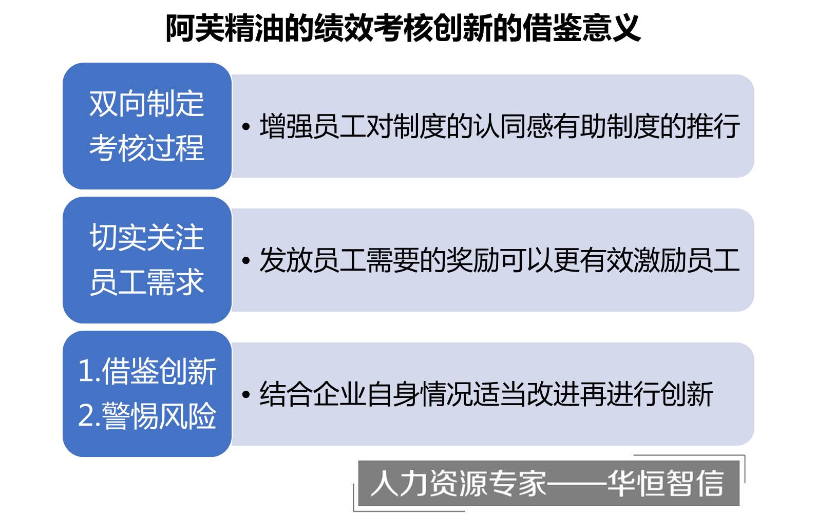 华恒智信认为无论形式如何,奖励是什么,阿芙精油拒绝KPI的做法依然是企业绩效考核的一部分,那么阿芙精油对绩效考核的创新对于其他企业有什么借鉴意义呢?