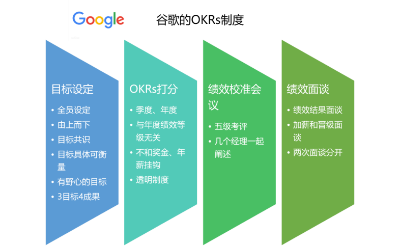 Google目标设定OKRs的执行程序包含有:设定目标、形成目标系统、考核打分、评分公开的流程。