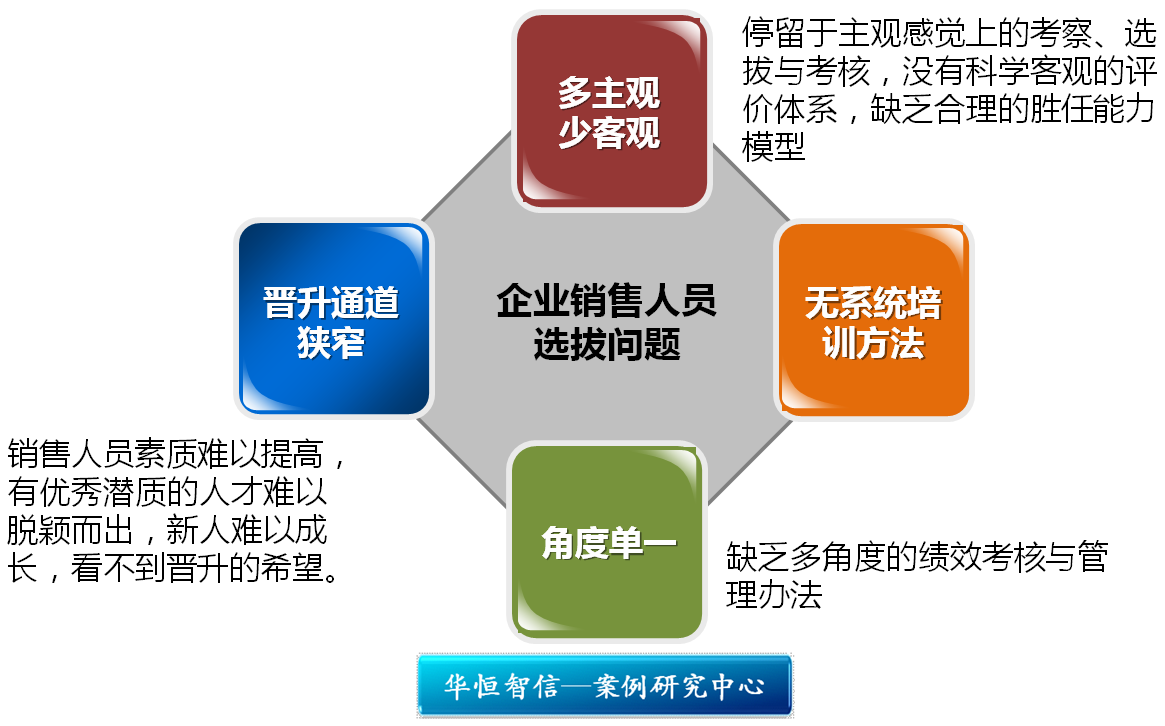 1、停留于主观感觉上的考察、选拔与考核,没有科学客观的评价体系,缺乏合理的胜任能力模型;