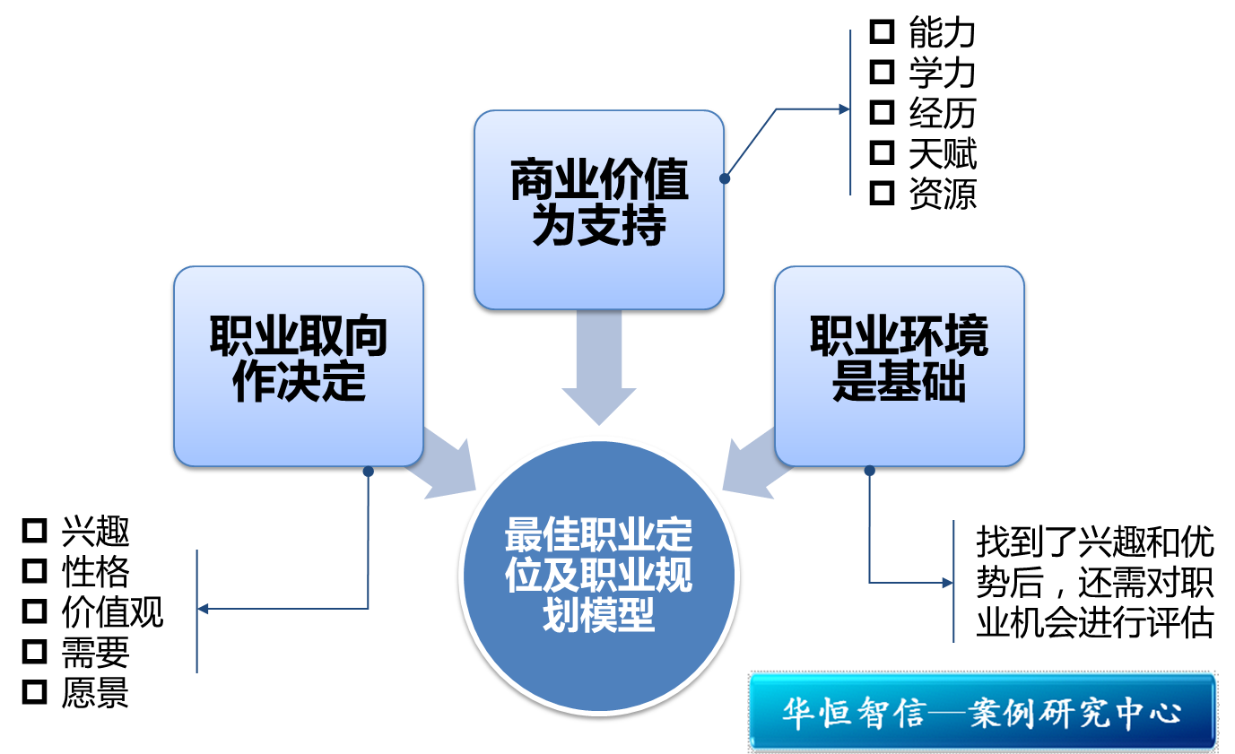 第一,职业取向系统是决定职业定位的主观影响因素,是由个人的主观选择来决定的。职业取向系统包括个人兴趣、性格、价值观、需要及愿景等,其中对职业的兴趣是关键影响因素。第二,商业价值系统是决定职业定位的客观因素,它包括个人的能力、学力、经历、天赋及资源等等。人是一个社会单位,商业社会中对能力、学力等的要求及考核标准是职业定位中需要参考的一些重要要素。第三,职业机会系统则体现在人在社会中的机遇与发展的环境等社会因素。