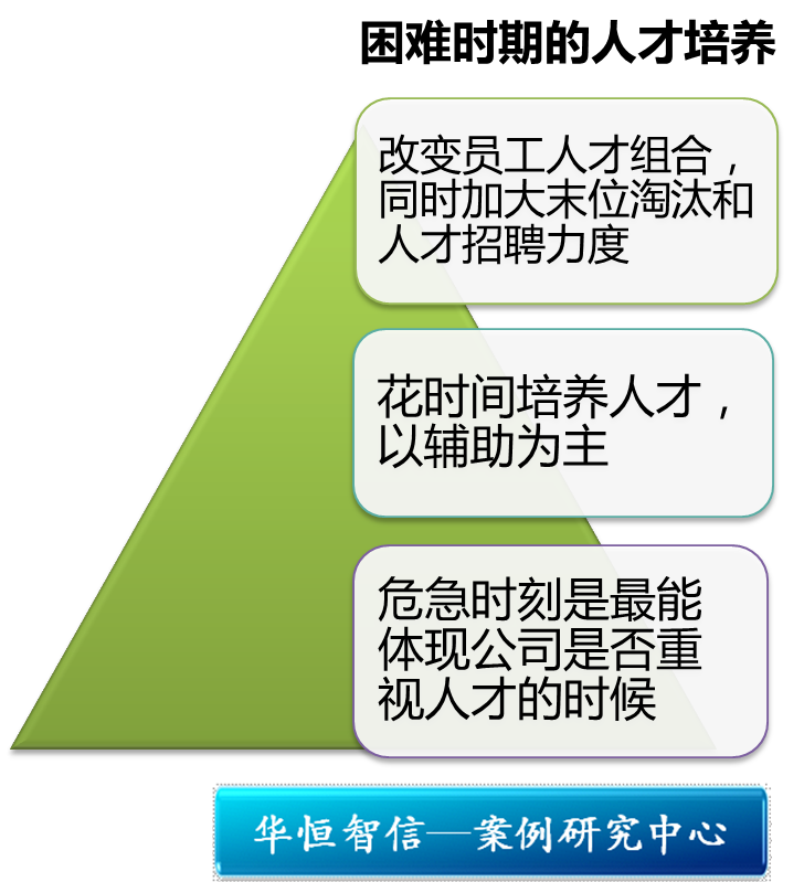 第一,这个时候是最好的机会去改变员工人才的组合,我们一方面加大末位淘汰力度,另一方面加大人才招聘力度。现在找人才比较容易,一般来讲我是借这样的机会来提升人才的组合。