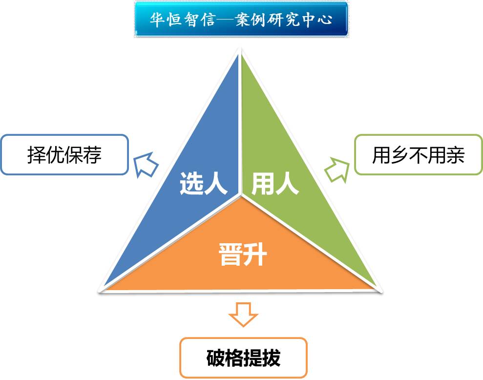 用乡不用亲——用乡是为了利用乡情加强凝聚力,不用亲是为了严格管理制度,尤其不用三爷(少爷、姑爷、舅爷);择优保荐——择优就是选择优秀的人才,保荐是实行担保制度,所用之人必须有具备一定地位的人担保,其问题由保荐人负责;破格提拔是对优秀人才打破常规,破格任用。
