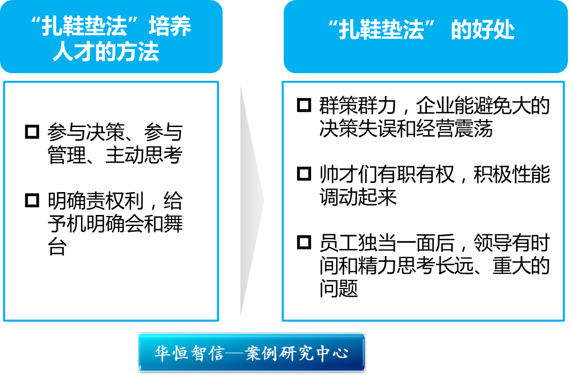 柳传志说,培养战略型人才跟培养优秀的裁缝师是同样的道理,不能一开始就给他一块上等毛料做西服,而应该让他从缝鞋垫做起。鞋垫做好了再做短裤,然后再做长裤、衬衣,最后才是做西装。不能拔苗助长,操之过急。即使是帅才,也要从最基本的工作做起,待到经验和能力都达到时,再给予更高的平台。