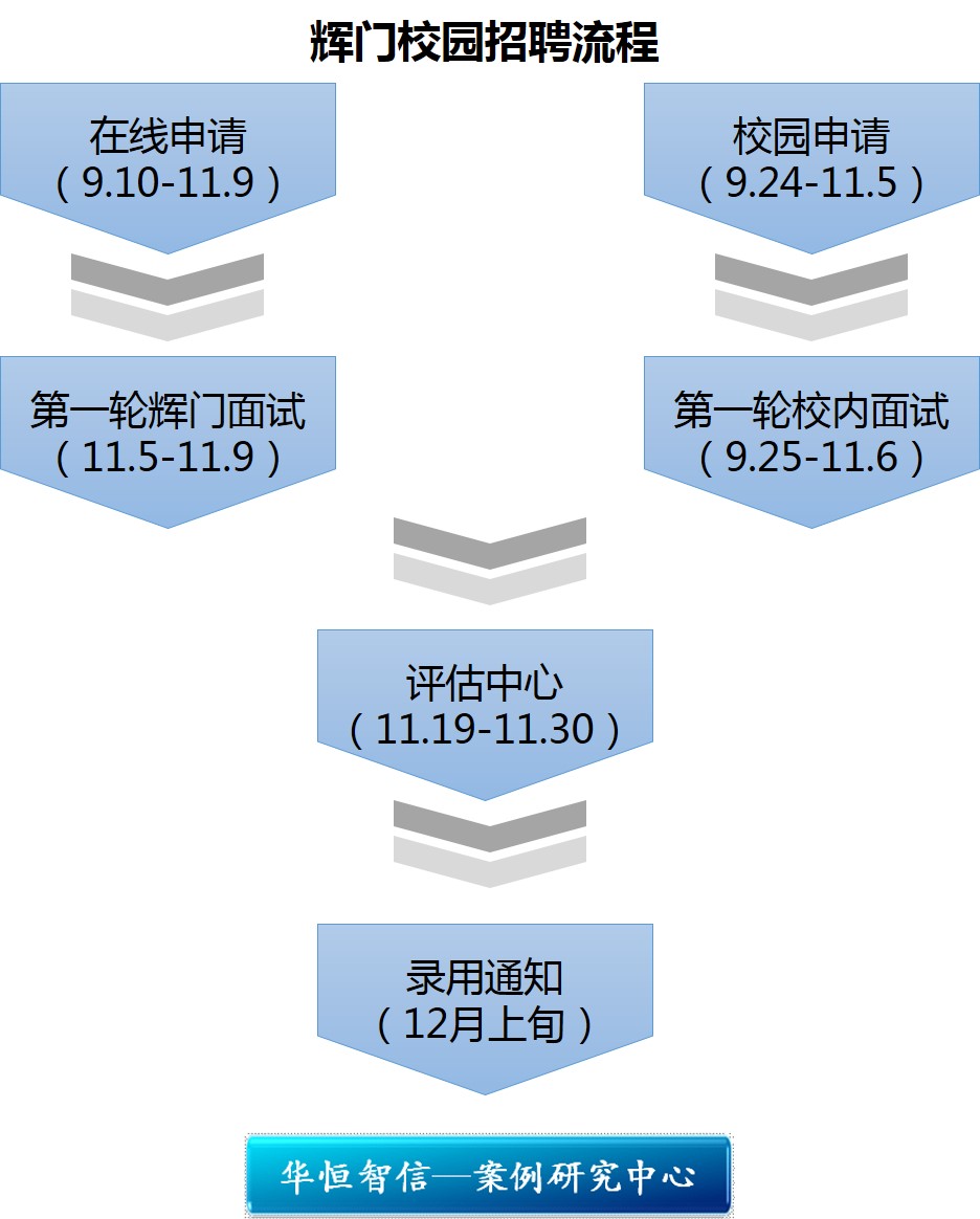 对校园申请者,辉门在其提交申请的当晚对简历进行筛选,通过筛选的申请者将在校园宣讲会的第二天接受首轮面试;对在线申请者,直接安排至公司面试。面试官由人力资源部门和业务部门的同事共同担任,面试同样以能力为核心,重点考核申请者的专业基础和技能、能否建立稳固的人际关系、有无领导潜力等。