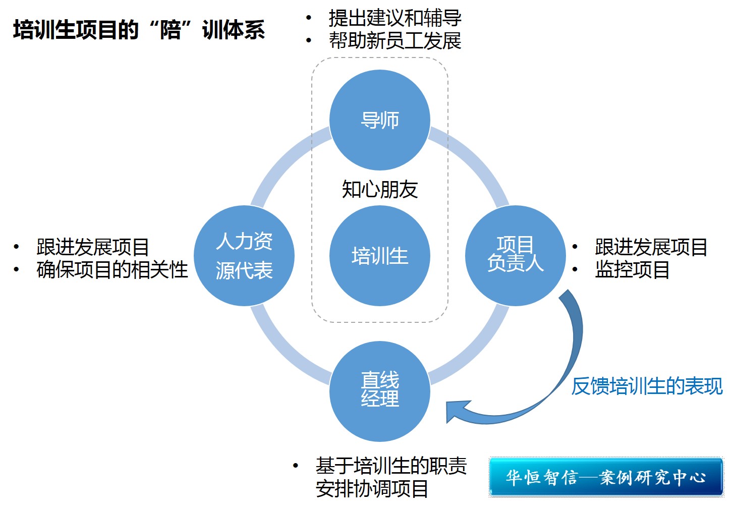 精挑细选招录来的培训生,大多信心满满,对未来充满憧憬,对公司和工作都有较高的期待,因此,配套的培养和发展才是留住他们的重要措施。为了让培训生快速融入组织,在实际工作中顺利发展,辉门为培训生安排了“直线经理”“项目负责人”“导师”和“人力资源代表”,他们各司其职,共同关心和帮助培训生。