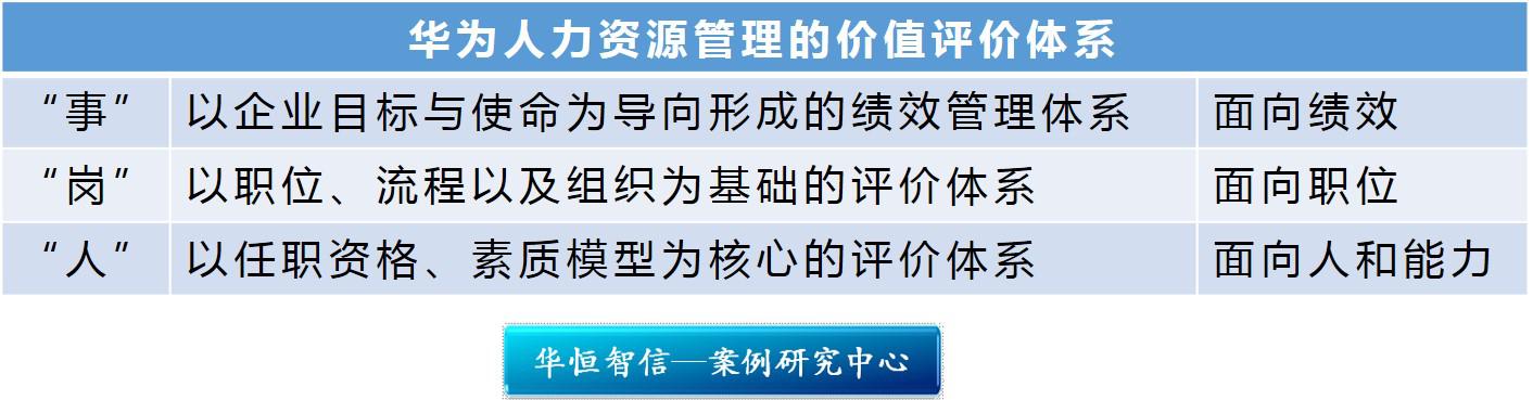 如上所述,华为素质模型在人力资源管理体系中有着明确清晰的定位,隶属于华为人力资源管理铁三角中的价值评价体系。在价值评价体系中,也包括三个模块,那就是以企业目标与使命为导向形成的绩效管理体系;以职位、流程以及组织为基础的评价体系;以任职资格、素质模型为核心的评价体系。那么这三个模块又构成了华为价值评价体系的铁三角:一块是面向绩效的,一块是面向职位的,一块是面向人和能力的。这三块可以归结为三个约定俗成的词汇:绩效用“事”来表示,职位用“岗”来表示,能力与素质用“人”来表示。