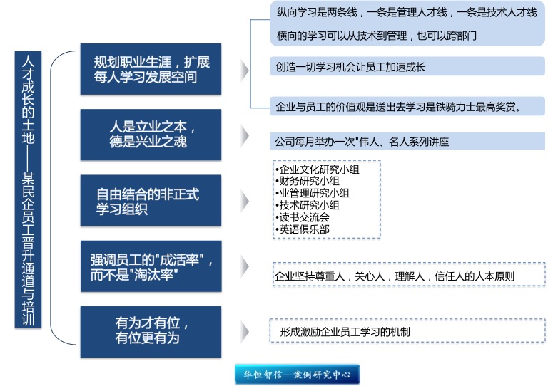 根据公司发展的需要,公司将各种职位归纳为78个岗位,每个岗位都有它的发展空间、权力和责任。公司要求员工,从自己职业生涯出发有目的地学习。纵向学习是两条线,一条是管理人才线,一条是技术人才线。横向的学习可以从技术到管理,也可以跨部门。公司还采取职务轮换制,如营销经理调任原材料经理或调任财务经理,以锻炼多种管理能力,提高员工的综合素质。这样,大大强化了员工学习的自觉性和目的性。