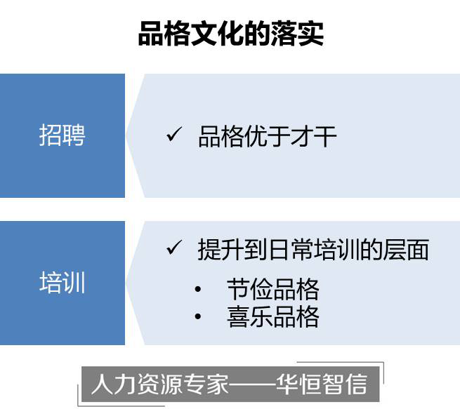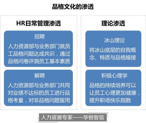 实际上,文化如何渗透到人力资源日常工作中,才是殷志平最为关注的问题。以往,HR寻找岗位人才最为注重的是员工的技术专长,但碰到那些很符合职业需求,但态度不端正或者做一些损害公司利益的行为时,就容易犯难。有才干的人相对更容易找到,也容易评估和培养,但找到具备优秀品格同时具备才干的人却比较困难。如果以品格作为基础,依品格用人,同时在工作中注重培养员工品格,在工作中实践、激励和表扬品格是解决人力资源管理难题的一种有效方式。