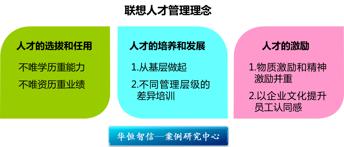 最后,人才的激励方面,除了为员工提供广阔的成长与发展机会之外,还重视对核心人才的激励,并且通过企业文化的落实,提升员工对企业的认同感,达到留人的目的。作为高新技术企业,研发人员是联想应重点激励的对象。联想对对研发人员的激励,不光采用物质奖励的方式,还加大对研发人员的事迹的宣传力度,通过精神奖励的方式让研发人员感受到在组织中的骄傲、自豪感。员工认为自己所做的事情对组织有贡献,组织也承认了员工的贡献,这将在很大程度上提高员工的工作积极性。此外,联想倡导一种平等、公开、透明、亲和的人际关系。通过企业文化的落实,让员工感受到企业对员工的重视,员工产生归属感,自然愿意留在企业。
