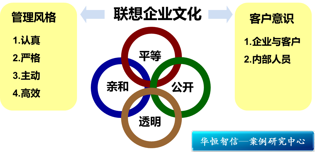 联想认为,许多企业文化的功败垂成,不是输在总体方向上,而是疏于通过细节对文化精雕细刻。成功的企业文化,正是通过点点滴滴的细节做起。联想倡导一种平等、公开、透明、亲和的人际关系。一方面,联想坚持认真、严格、主动和高效的管理风格。另一方面,联想为管理部门的定位与众不同:“让你的服务对象感觉你是一个负责的值得信赖的管理者,让你的管理对象感觉你是一个热心的可以托付的服务者”。客户意识不仅存在于企业与客户之间,内部人之间也应具有客户意识。