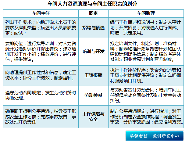 人力资源管理人员的职责:因为人力资源管理人员既对车间负责又对人力资源部负责,所以他们各自的职责应从两方面来划分。