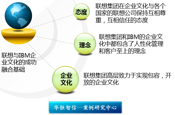 联想与IBM企业文化的融合是关键的一步同时也是极具挑战的一步,两个不同国家,不同文化基础的企业能够成功的合二为一是值得跨国企业学习与总结经验的。联想与IBM企业文化的成功融合基于以下几点: