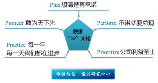 联想相关负责人告诉本刊,4P文化是多方共同讨论出来的,把美国和国际上的准则结合起来,并受到联想创始人创业精神的影响,目的就是让主人翁精神能在公司生根发芽,杨元庆等联想高层为此多次到海外宣讲。2012年初,联想又在4P文化基础上增加了1P(pioneer),翻译成文中是“敢为天下先”。先前提出的4P文化,主要是强调执行力,而增加的第5P就是鼓励要不断创新。
