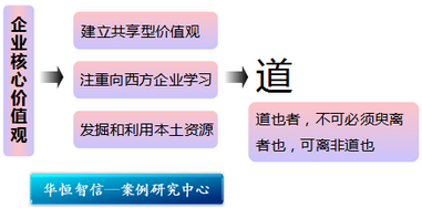 华为、联想这些优秀中国企业在建立共享型价值观时,都很注重向西方企业学习。但不能忽视的是,如何充分发掘和利用本土精神资源的问题。这里深层次的原因在于,企业的核心价值观,如果要成为企业长远发展的基础,必须上升到“道”的高度,“道也者,不可必须臾离者也,可离非道也”(《中庸》)。必须具有一种无庸质疑、不可妥协、毫无谈判余地的特质,也就是说,除了在理性层面、情感层面、行为层面得到员工的认同,还必须进入信仰的、精神的领域。