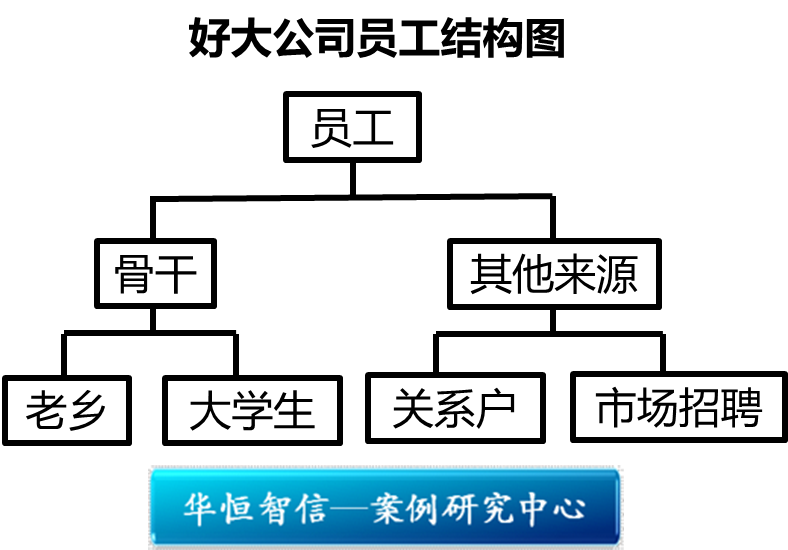 好大公司的员工还有两类来源:一是关系户,二是在市场招聘。 关系户不言自明,对于从市场招聘的员工,缺少严密的计划,也缺少明确的人力资源政策,进出都非常随意。这里有两个事例。厉红军在和深圳市某机关谈一个大型的房地产项B,某机关认为好大公司技术力量不足,很难获得这个项目。厉总灵机一动,提出在房地产事业部要招收30个工程师,后经李副总劝说,才改为招20个人。招进这些人后,房地产项目并没有谈成,这些人半年无所事事,最后陆续离开了公司。这件事使好大公司耗费大量资源,厉总的威信也急剧下降。另一个例子是:公司运作一年以后,由于在外地开发的房地产项目受挫,深圳的项目也不着边际,他受到董事会的指责,他又提出要把深圳的员工全部辞退,后又被李副总劝阻。