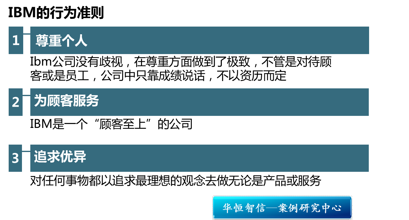 这些准则一直牢记在公司每位人员的心中,任何一个行动及政策都直接受到这三条准则的影响,“沃森哲学”对公司的成功所贡献的力量,比技术革新、市场销售技巧,或庞大财力所贡献的力量更大。IBM公司对公司的“规章”、 “原则”、“哲学”或并无专利权。“原则”可能很快地变成了空洞的口号。