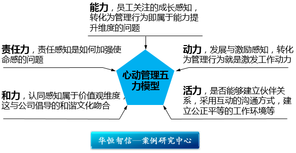二、明确能够激发员工“心动”感知的管理行为。客服(广州)中心分析了现有的管理模式,将8种心动感知合并同类,整合建立了“心动管理五力模型”。具体来讲,员工关注的成长感知,转化为管
