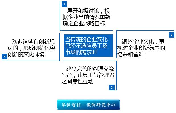 Superjuice公司如果想在这场变革中重新占领市场份额,就必须采取积极的应对措施,而不是根据市场反应消极的应对。在这里,华恒智信建议注意以下几个方面的问题:1.对企业目前发展的问题展开积极讨论,根据企业当前情况重新确定企业战略目标,有助于推动企业发展。2.调整企业文化以配合战略目标的实现,重视对企业创新氛围的培养和营造,对创新活动遇到的困难,领导需要大力支持并拥护创新,确信创新结果能够为企业赢来新的竞争优势,塑造企业品牌形象。3.建立完善的沟通交流平台,让员工与管理者之间良性互动,鼓励员工为公司提供创造性建议,提供给员工开放包容的企业文化环境,需要高层领导的长期支持。4.对因为以前抵触公司文化而走的优秀员工,可以对他们进行开放政策,欢迎这些有创新想法的,对企业依然有感情的员工再次加入,形成团结包容创新的文化环境。