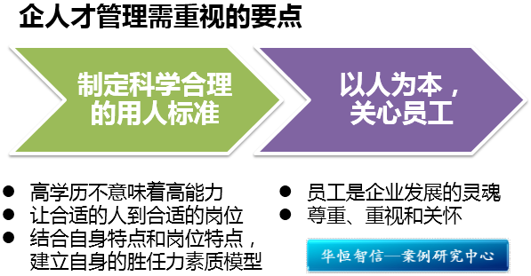 1.制定科学合理的用人标准。丰田不以学历为选拔人才的标准,并且反对采取在教室里上课这种培训形式。高学历不意味着高能力,企业必须明白什么样的人才是自己真正需要的,自己需要的人才需要具备什么样的素质。让合适的人到合适的岗位,这是最基本的用人之道。人才的标准需要结合企业的实际和岗位的特点去制定,这样才能选到真正适合企业发展的人才。华恒智信认为,对不同的企业来说,岗位的关键胜任力有所不同,它和企业的发展战略和方向密切相关。有的企业倡导的是创新,有的企业却倡导的是严谨,这样的不同导向带来对员工的要求也不同,素质标准也有所差异。企业必须结合自身特点和岗位特点,建立自身的胜任力素质模型。