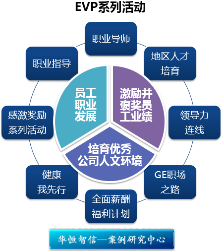 2009年初,GE在中国正式推出EVP系列活动,活动在为所有员工的职业发展提供有效指引的同时,也为倡导健康高效的工作生活献计献策。经过两年多来的发展,EVP系列活动不仅在北京、上海等沿海大城市成功开展,而且随着公司区域化策略的深入,EVP已被推广到了更多的内陆城市以覆盖更多的员工。围绕着员工职业发展,激励并褒奖员工业绩,培育优秀公司人文环境三大核心领域,EVP系列活动的内容涉及职业指导、职业导师、地区人才培育、领导力连线、GE职场之路、全面薪酬福利计划、健康我先行、感激奖励系列活动等主题。