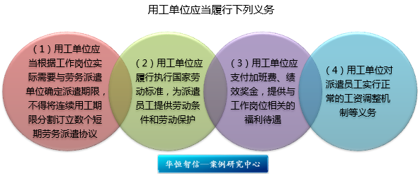 在叙述风险应对措施之前,这里有必要先说明一下《劳动合同法》下实际用工单位的义务,根据《劳动合同法》的相关规定,用工单位应当履行下列义务:(1)用工单位应当根据工作岗位的实际需要与劳务派遣单位确定派遣期限,不得将连续用工期限分割订立数个短期劳务派遣协议;(2)用工单位应履行执行国家劳动标准,为派遣员工提供劳动条件和劳动保护;(3)用工单位应支付加班费、绩效奖金,提供与工作岗位相关的福利待遇;(4)用工单位对派遣员工实行正常的工资调整机制等义务。