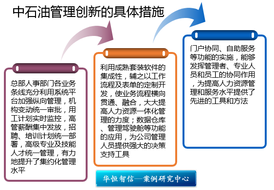 更重要的是管理创新。中国石油积极发掘系统功能与业务需求的最佳结合点,实现管理理念和方式的创新。总部人事部门各业务条线充分利用系统平台加强纵向管理,机构变动统一审批,用工计划实时监控,高管薪酬集中发放,招聘、培训计划统一部署,高级专业及技能人才统一管理,有力地提升了集约化管理水平;利用成熟套装软件的集成性,辅之以工作流程及表单的定制开发,使业务流程横向贯通、融合,大大提高人力资源一体化管理的力度;数据仓库、管理驾驶舱等功能的应用,为公司管理人员提供强大的决策支持工具;门户协同、自助服务等功能的实施,能够发挥管理者、专业人员和员工的协同作用,为提高人力资源管理和服务水平提供了先进的工具和方法。
