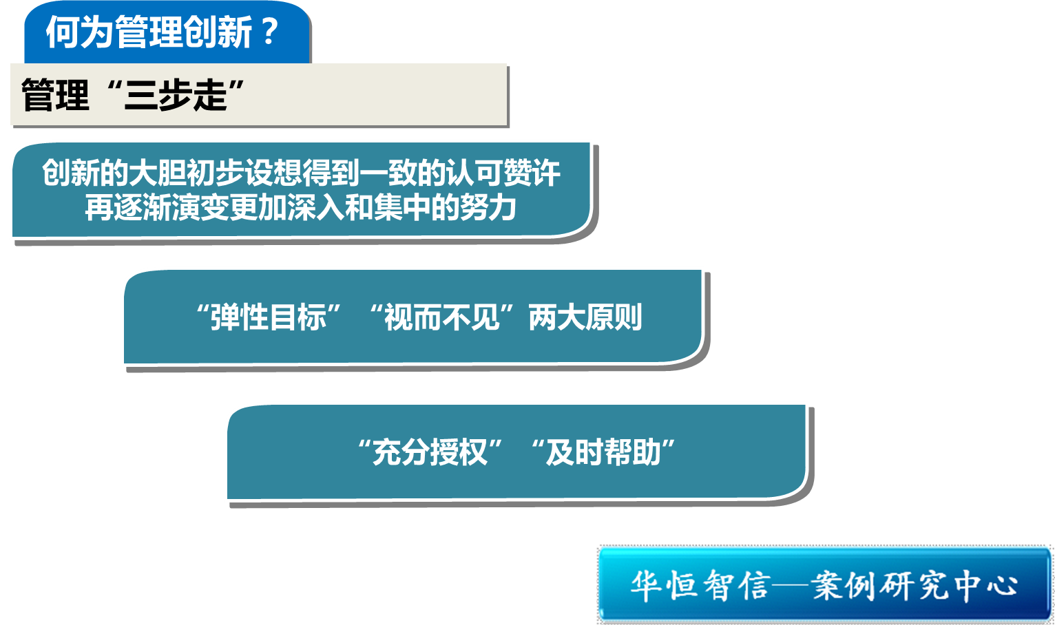 第三是“授权原则”,对此余俊雄俊雄有着切身体会——总部对他关于中国市场事务的处理给予充分授权。在具体的创新操作过程中,授权是在员工已做好创新的思想准备之后让他们开始工作,但创新主要还要靠他们自身的动力。当他们在发明创造时,公司就要及时给予帮助。