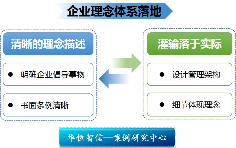 一个企业的理念体系包括:企业理念、企业价值观、企业形象等三个层次。(乔东,2003)企业理念是企业理念体系的核心,企业理念包括对企业发展的定位、战略及未来的愿景。它是企业发展的灯塔,是整个企业的理想化未来,是所有企业成员共同追求的目标。企业价值观是企业对待员工、客户、工作的行为准则,它是企业日常管理的标杆,用于指导企业的运作。企业形象则包括企业本身的形象与企业在社会公众眼中形象两个方面。一个可以落地的企业理念体系是企业健康发展的必要保证。