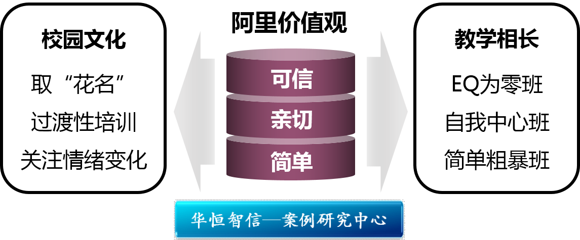 阿里巴巴最早的价值观只需6个字便可概括:可信、亲切、简单,最突出的企业文化就是校园文化和教学相长。在这里,员工、上下级之间和同事之间都像同学一样相称,除了中英文名之外,阿里巴巴的每一位员工还有一个“花名”,比如马云的“花名”就是“风清扬”。这样一种文化使得学生从学校进入公司后没有那种巨大的落差。阿里巴巴组织的一些培训让刚刚走出象牙塔的学生有了一个很好的过渡,能够在工作中学习,并且关注员工的心理,关注他们的情绪变化。