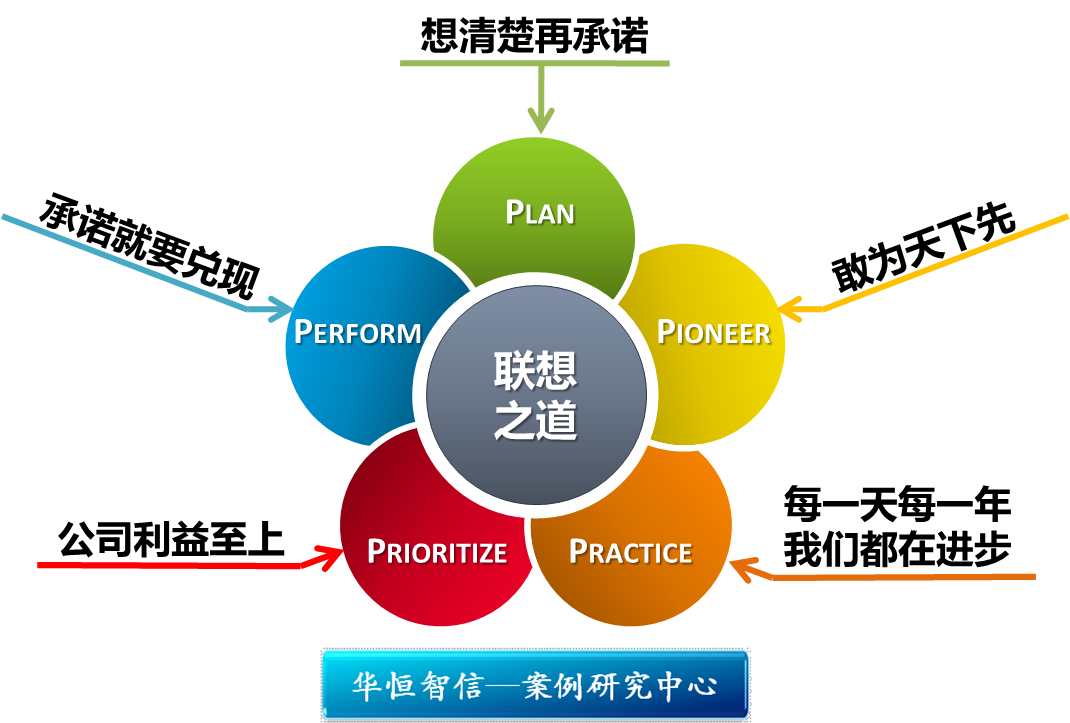 “联想之道”的核心理念是:“说到做到、尽心尽力”。5P文化是:Plan——想清楚再承诺,Perform——承诺就要兑现,Prioritize——公司利益至上,Practice——每一年、每一天我们都在进步,Pioneer——敢为天下先。这样的企业文化渗透进了联想的方方面面,作为软实力的核心组成部分加速了联想企业的发展。