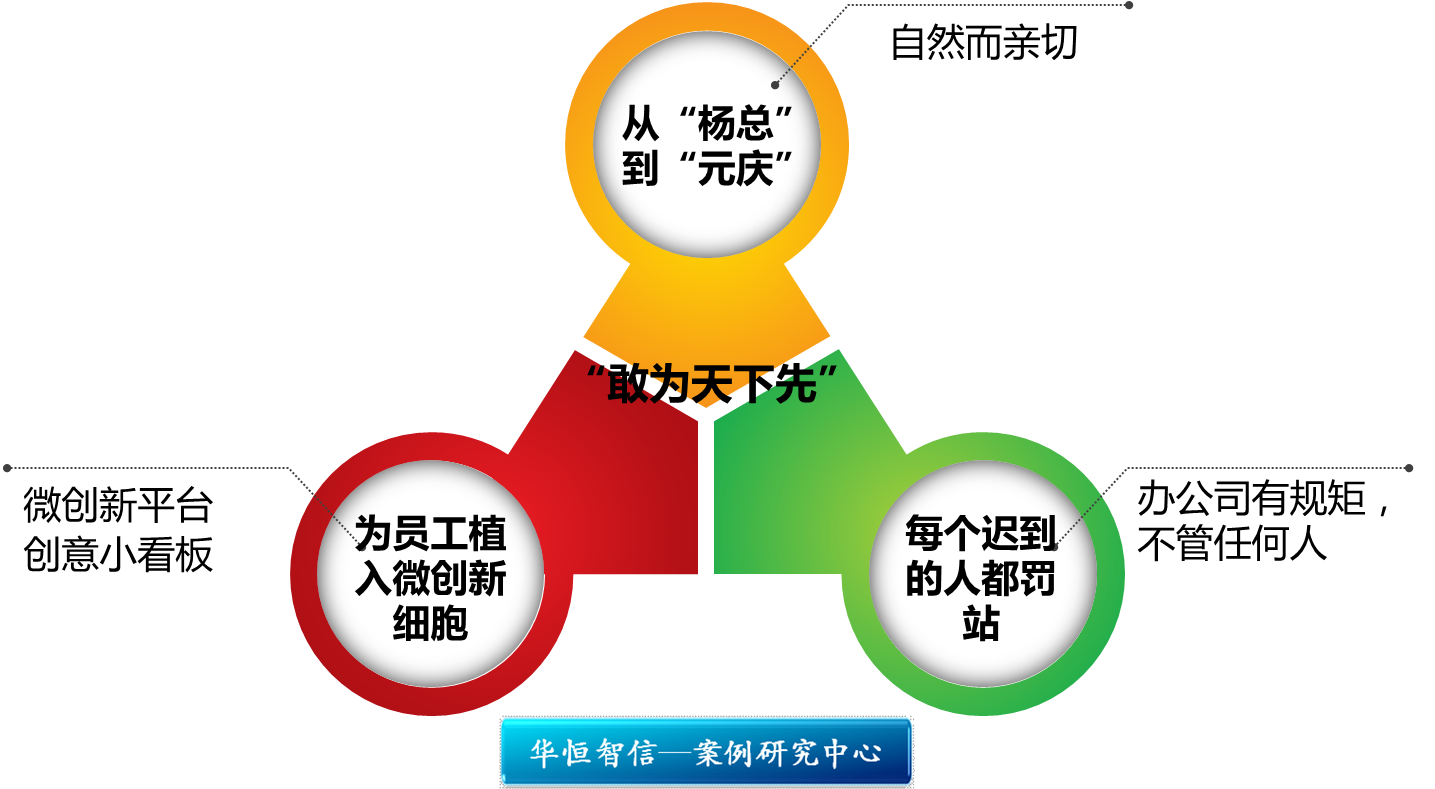 案例介绍了“敢为天下先”这一条文化的三个具体表现:去“总”,微创新,任何人迟到都要罚站。这三条审核规定使得“敢为天下先”这条抽象的文化具体化,能够真实地反映并且运用到公司日常管理中来,这是值得HR借鉴的。