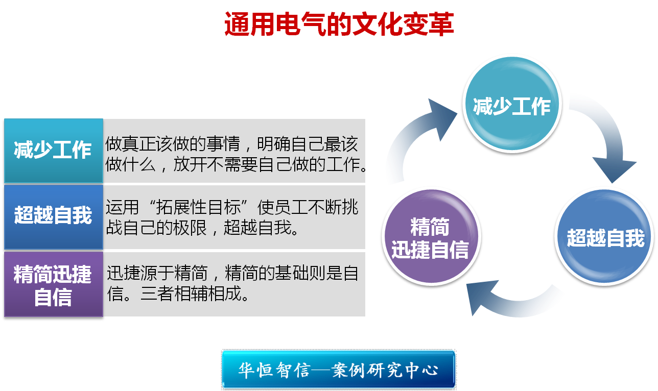 对不断变革的承诺使得通用一百年来一直愿意尝试新事物,总愿意进行变革。有成功的事情,但那是过去的成功,通用并不感到满足,而总是从新、从头做起,这就是通用电气对变革的承诺。通用大力对人才进行投入,而且有着良好的、以业绩为主的文化。大胆抓住每个机会,应对每个挑战,不懈追求更快、更好。这些就是通用电气的文化精髓。