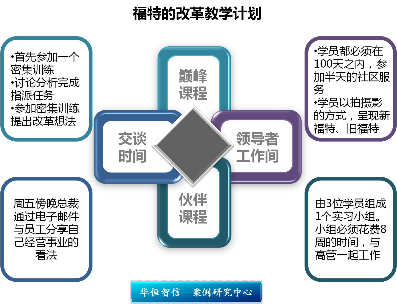 按照计划,福特的高层管理人员从听课与教课开始,逐步进行企业文化的改革。这主要有四个部分组成: