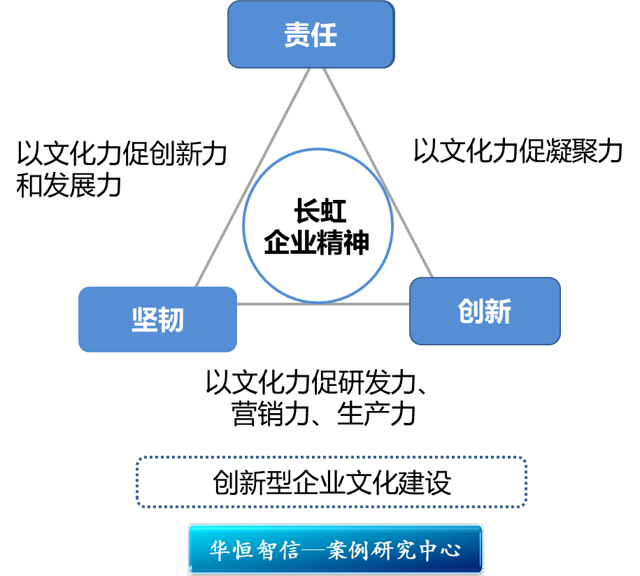 长虹创新管理来源于创新导向的企业文化,因而不同导向的企业文化相应的也拥有不同的管理政策和管理制度。经过多年的实践研究,华恒智信研究团队认为企业文化有四个类型导向,分别为:创新导向的企业文化,即要求企业不断创新管理理念和管理方式;规则导向企业文化,即要求企业有一系列规范的管理制度和管理政策;目标导向的企业文化,即要求企业在各个阶段明确其发展目标并不断努力实现各目标;支持导向的企业文化,即在管理上对员工的工作给予支持和关怀。