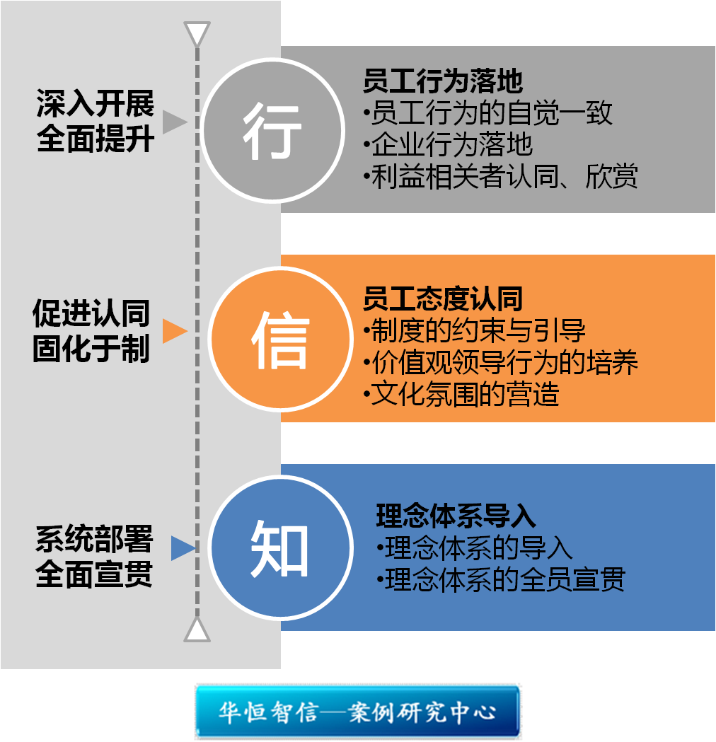 中间层次是“信”,重点在于员工从态度上能认同文化的内容和相关的制度要求,制定与文化匹配的制度体系是关键。