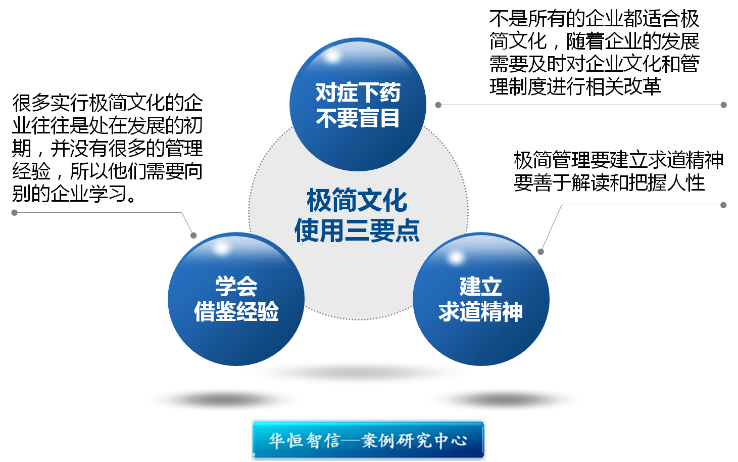 关于极简文化的建议,华恒智信结合多年的研究和实践经验,认为企业应该注意以下三点: