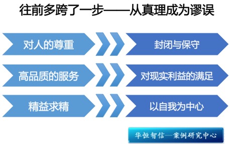 整个七八十年代,IBM都得意洋洋地沉浸于行业霸主的优越感中。但进入90年代,IBM却突然发现,自己被PC的新潮流抛弃了。业界普遍认为,IBM从硬件到软件大小通吃的年代已经结束,取而代之的将是微软、英特尔这样专注于某一部分的“新公司”。但1993年上任的新CEO郭士纳并不这样看,在他看来,IBM的衰落表面上是战略上的失误,即IBM从战略方向上固守大型机而错过了PC大发展机会,放弃了芯片与操作软件的主动权,给了微软和英特尔以大发展的机会,但事实上,在这种失误的背后是IBM文化出了问题,“真理往前跨了一步”,便成了谬误。