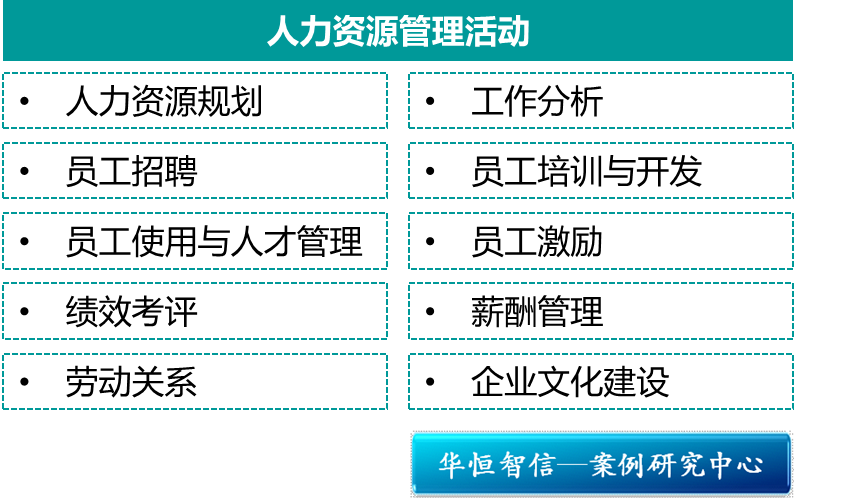 人力资源管理实践活动就是为了实现组织的战略目标,利用现代科学技术和管理理论,通过不断地获得人力资源,对所获得的人力资源的整合、调控及开发,并给予他 们报酬而有效激励与开发利用。人力资源管理活动包括以下内容:人力资源规划;工作分析;员工招聘;员工培训与开发;员工使用与人才管理;绩效考评;薪酬管理;员工激励;劳动关系;企业文化建设。