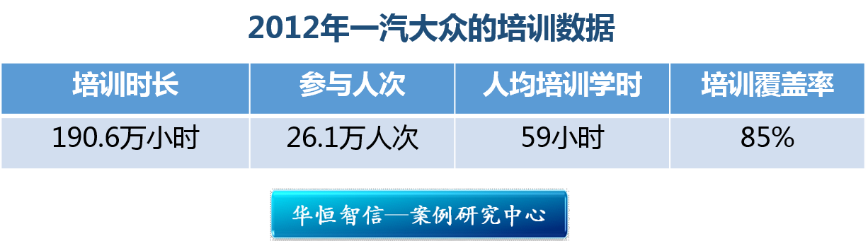 一汽-大众还十分注重对新老员工的培训和能力的开发。一汽-大众的培训理念是:培训员工是企业的责任,也是各级经理人员的责任和任务;接受培训是员工的义务和权利。因此,一汽-大众整个企业已经建立非常好的培训和学习的文化。2012年,一汽-大众共完成培训190.6万小时;各类培训共有26.1万人次参加;人均年培训学时 达到59小时;培训覆盖率达到85%。同时,在长春、成都和佛山三大基地,一汽-大众还建设了总计近三万平方米的全方位、全覆盖的培训中心。