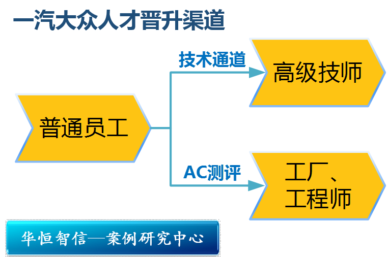 经过22年的发展和积累,一汽-大众已经形成了公平、公正、客观、完善的人才选拔、培养、晋升和匹配机制,为员工提供了良好的平台和渠道。在一汽-大众,每一个普通员工都可以选择专业技术或管理两个不同的发展通道。即一个普通的车间生产操作人员可以在技术通道向高级技师的等级晋升,也可以通过一汽-大众AC测评进入管理通道,向工长、工程师晋升。这种开放的职业发展路径不仅是员工成长的动力,更是整个企业发展的动力。