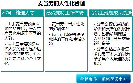 麦当劳作为全球最大的连锁快餐企业之一,其不但没有遇到员工流动过快,企业留人困难等普遍餐饮业遭遇的问题,反而成为最佳雇主,员工的满意度很高,而且麦当劳员工中有75%的员工完全敬业,这在其他企业是很难做到的。由上述案例可知,麦当劳在人员招聘方面,颇具特色,认为最重要的是应聘人员的能力是否达到职位的要求,个人行为是否符合企业文化。让人印象深刻的是其对员工的人性化管理,这也是麦当劳成功的关键。例如:设计人性化的薪酬体系,让员工自我激励;给员工提供独特的工作和生活体验;为员工规划最佳成长轨迹等等。
