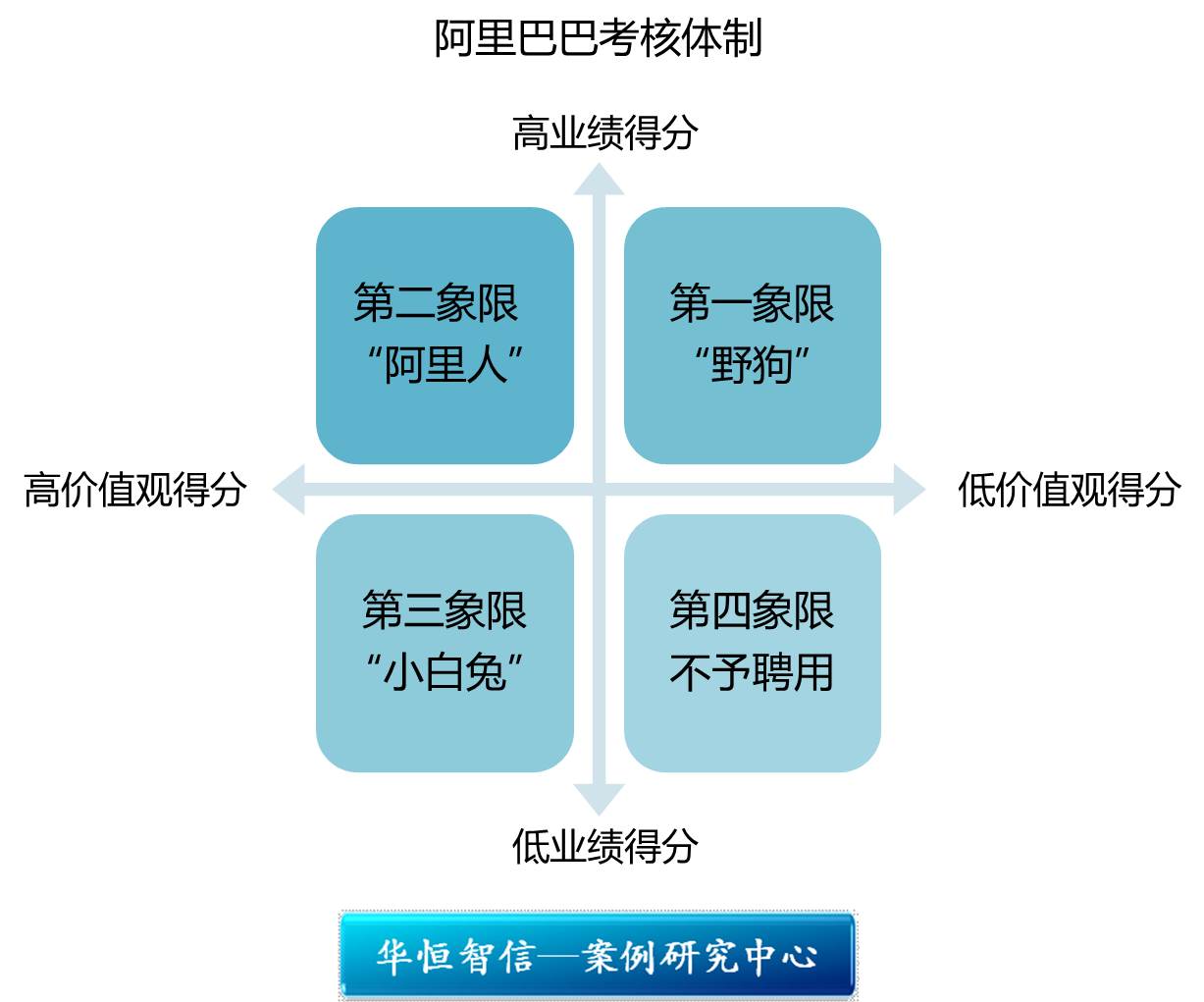 2个基本的考核维度分成了4个象限:一个维度是传统的业绩因素,另外一个是创新的价值观因素,一个有高业绩的人在一般的企业里会有很好的评价,但是,在阿里巴巴还不够,如果价值观得分低,也不会是一个胜任工作的人,从而落在第一象限,这类员工被比喻为“野狗”;相反,有的人可能在价值观上获得高分,但如果不能取得高的业绩也不合格,会被称作“小白兔”,落在第三象限中;只有第二象限的员工是被鼓励的,被称作“阿里人”,价值观和业绩得分都很高。