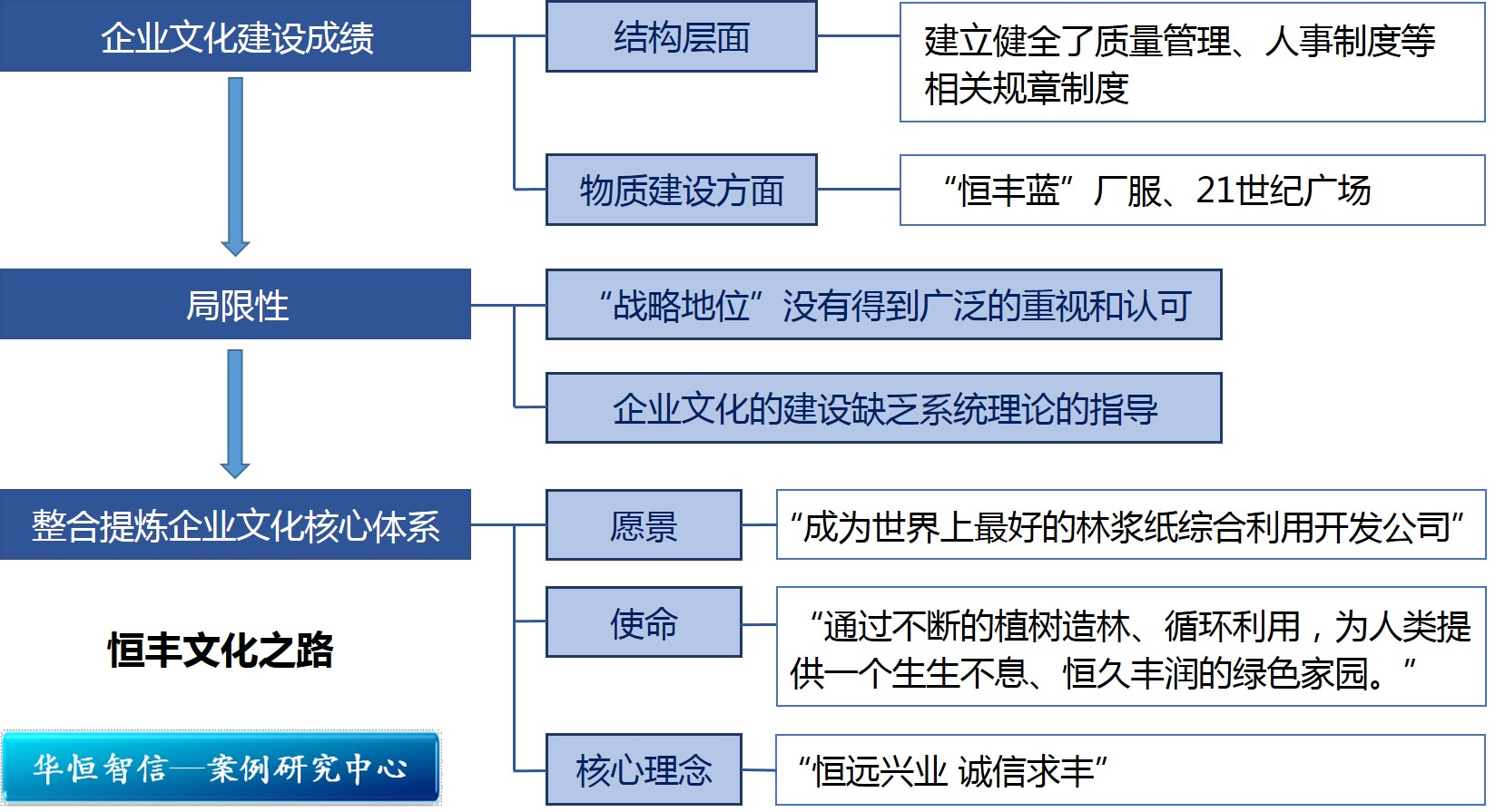 作为一个经历了50年发展,特别是在改革开放20多年中成功转型的企业,恒丰集团已经变革中、在企业文化建设的道路上积累了一定的经验、取得了一定的成绩,比如公司已经提出了建设企业文化的战略性课题,并为此建立了专门的企业文化建设推广部门。对于恒丰精神、恒丰作风、办企宗旨等一系列企业文化核心要素也进行了一些提炼。在企业文化的结构层面上,建立健全了质量管理、人事制度等相关规章制度,让一部分文化理念能够通过日常的运营、生产、人员管理落实在实处,让广大员工能够亲身感受到企业提出的理念。在企业文化物质建设方面,恒丰也 投入颇丰,在牡丹江市知名度颇广的“恒丰蓝”厂服、一进大门就让人眼前一亮的21世纪广场……都是恒丰企业文化建设的物质体现。但是,从企业文化建设和发展体系的角度来看,当时的恒丰企业文化建设尚处于较为初级的阶段,企业文化的“战略地位”没有得到广泛的重视和认可,企业文化的建设缺乏系统理论的指导。长期以来,企业习惯于把生产经营领域的管理当成“正事”,除此以外都当“副业”处理,人为地将企业文化建设与企业管理“分家”。无论是企业文化建设的组织管理者,还是活动方式、活动范围等,往往与企业管理关联不大。大多数的企业文化建设都是在组织文体宣传活动,即使个别活动有生产管理人员介入,也是走过场而已。企业是物质文明建设的主战场,可一沾上“文化”的边,许多人就想当然地联想到了厂报和文化宫,使得恒丰的企业文化建设停留在一般性的文化活动层面上。这种内涵理解上的不深刻与企业文化建设方式的单一也加剧了恒丰在企业文化建设上的局限性和短期行为,以致最终导致了它的“文化包装”身份。