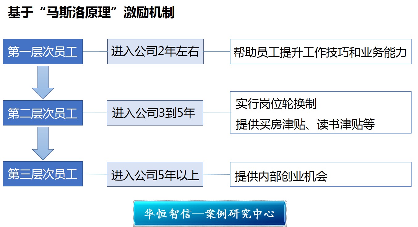 第二, 基于马斯洛需求层次的激励机制。马斯洛需求的五大层级主要包括生理需求、安全需求、社交需求、尊重需求、自我实现需求。员工处于不同阶段时,其激励因素有所不同。根据员工的敏感因素进行具有针对性的激励,能使激励效果更佳显著。明基的激励制度按照不同年龄段员工所表现出来的不同需求,分别给予适当的刺激。