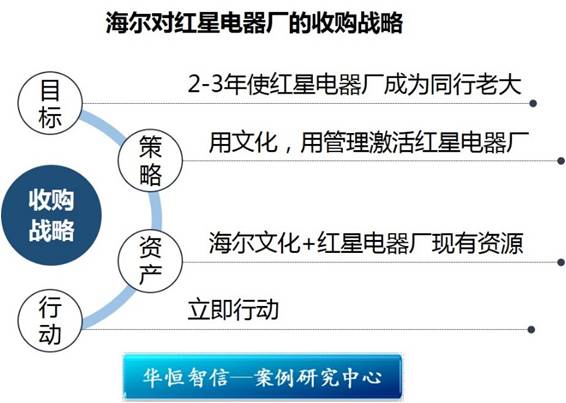 对于海尔来说,这是一个非常重大的兼并事件,因为在95年之前,海尔还没有大规模的扩张它的企业,去兼并企业。随后,海尔的总经理对红星电器做了一个全面的分析,在分析的过程中间,他们发现青岛红星洗衣机总厂第一不缺资金,第二它们有现代化的生产流程的设备,第三它也不缺技术力量,分析之后得出结论:红星电器败在它的管理模式上和它的企业文化上。于是,海尔通过对它的分析研究之后,决定用无形资产,用文化来盘活红星电器厂,并同时对红星电器厂做了这样一个收购战略:目标——2-3年使红星电器厂成为同行老大;策略——用文化,用管理激活红星电器厂;资源——海尔文化+红星电器厂现有资源;行动——立即行动。