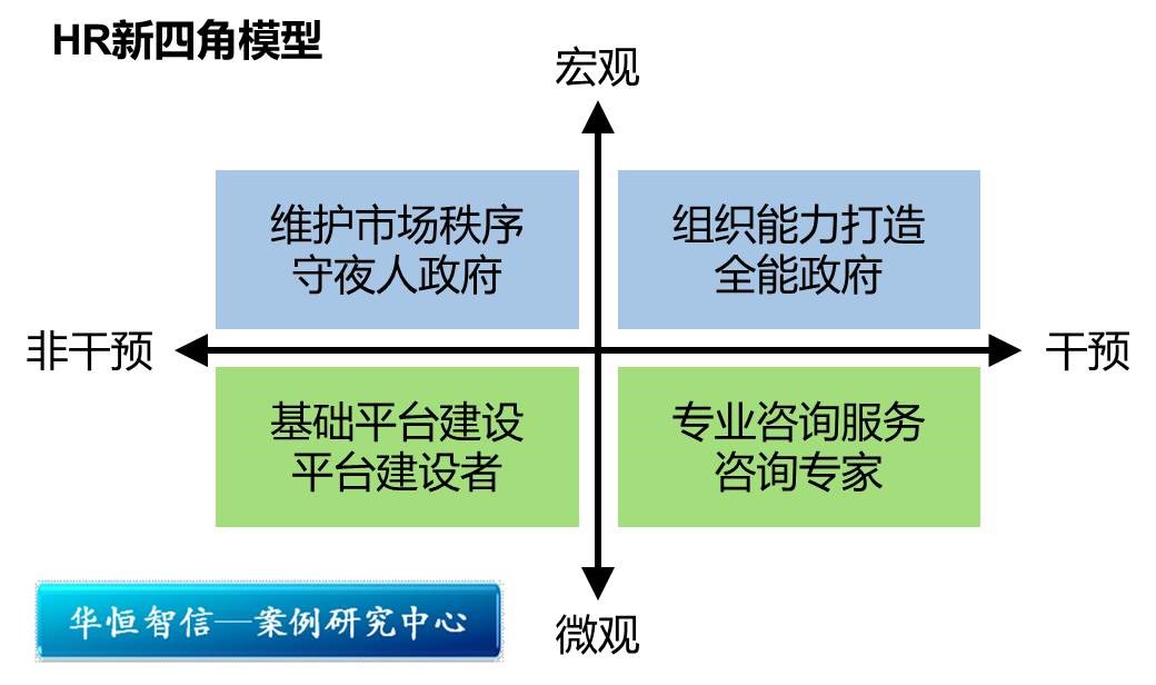 云时代,HR的职能应该用新四角色模型(见下图)来描述。这一模型依然是从两个维度划分出四个角色。一个维度决定介入层面是宏观(上天)还是微观(入地),即关系整个组织,还是关系局部;另一个维度决定介入的方式是干预(入地)还是不干预(上天),即是维护内部市场的自然力量,还是主动塑造市场的格局。