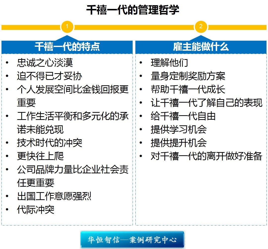 千禧一代,也即我们通常所说的80、90后,这一代人有着相对低的忠诚感、渴望自由、看重晋升机会、偏向国外工作等特点,企业对这一代人的管理需要突破原有的管理模式,理解他们、提供机会、做好其离开的准备等都是必不可少的管理内容与心理准备。对这一代的管理,具体还应该做到哪些呢?对此,华恒智信分析员提出以下几点建议: