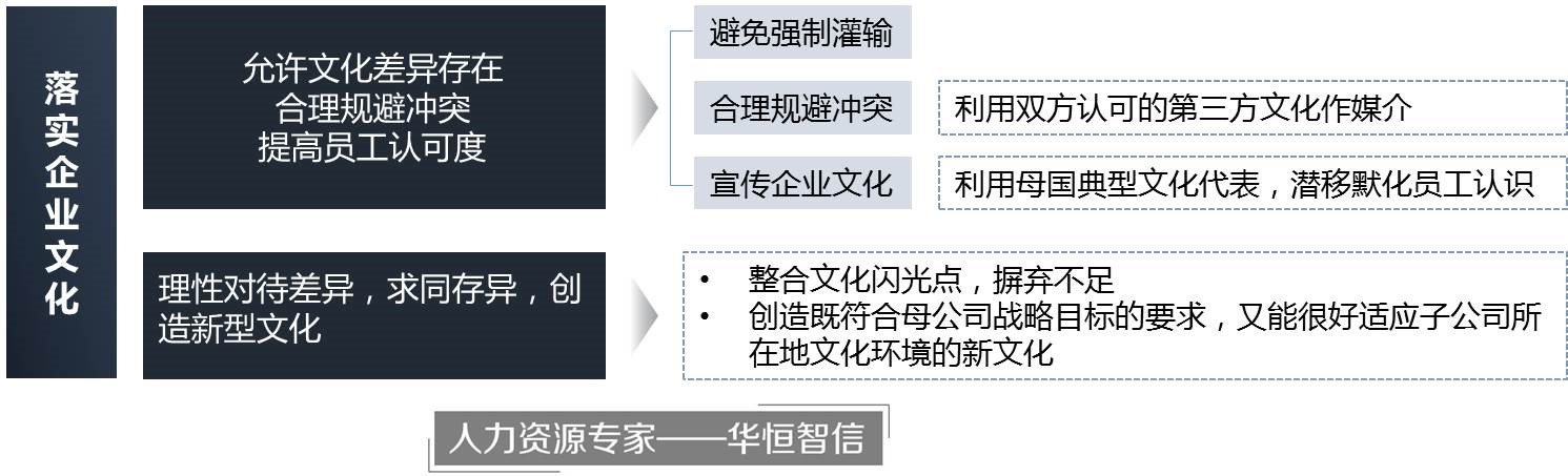 母公司优秀文化的宣传、落实效果关乎子公司经营管理效果,对跨国公司整体经营战略和竞争力产生了深刻的影响。与中国公司刚起步的跨国经营相比,美国、英国、德国等发达国家跨国公司的文化落实较为容易。这一情况受到我国现处于并长期处于社会主义初级阶段的经济实力所影响——经济发达地区的文化更容易被经济落后地区的员工所接受,所以中国的优秀的管理文化在发达国家落实比在发展中国家落实要更为困难。为此华恒智信结合咨询管理经验,提出以下两点建议: