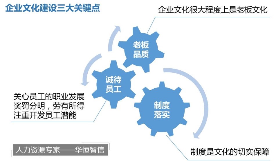 企业文化作为一个企业的软实力,它仿佛那只“看不见的手”,往小了说,它潜移默化地影响着一个员工的思考方式、做事态度、行为习惯等,往大了说,它直接或间接地决定着企业的发展。因此,现在有越来越多的企业开始重视企业文化建设问题,不再将其视为可有可无的东西。然而,企业文化并不是提出几句口号或是复制行业里标杆企业的企业文化那么简单。企业文化建设可以借鉴别人的成功经验,但更重要的是要结合企业自身的实际情况,找到适合自己的企业文化并付诸实践。华恒智信专家结合多年的实践经验,就如何建设好企业文化的问题提出三个关键点。