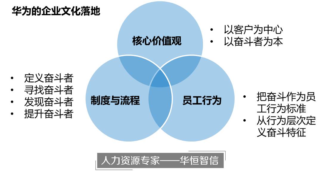 华为的企业文化中很重要的一点是艰苦奋斗,上至总裁任正非,下至刚进入公司的应届生,对这一企业文化的认同不仅仅停留在口号层面,而是转化为具体的行动,这也是为什么华为的员工都愿意毫无怨言的到基层岗位,而且能不断成功开拓条件艰苦的海外市场的原因。华恒智信指出,企业文化的建设过程中应该重点注意以下两个关键步骤。